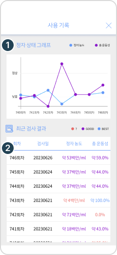 OVIEW-M 1.0 App Guide 최근 결과 A 최근 결과 선택 최근결과를 선택합니다. B 최근 결과 화면 누적된 분석 결과에 대한 선형 그래프입니다. 누적된 분석 결과에 대한 수치 정보 리스트입니다. ⓒ 2023 Intin Inc. all rights reserved.