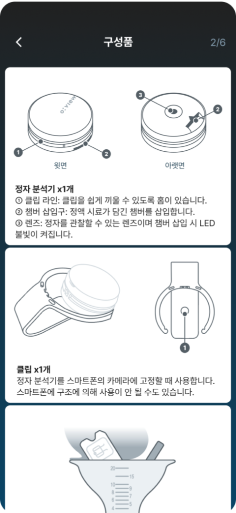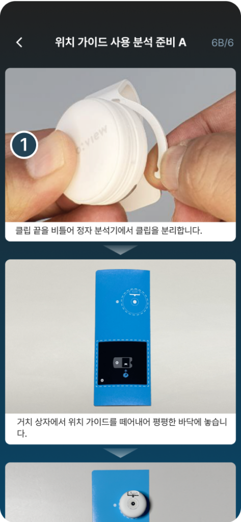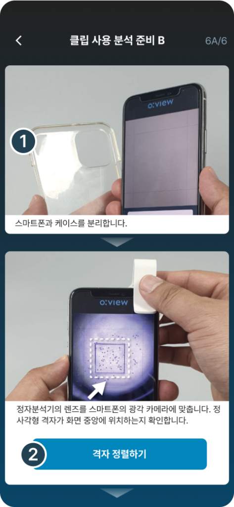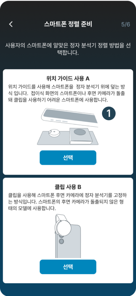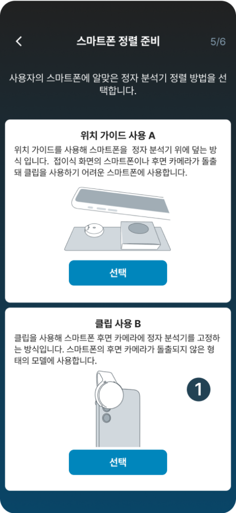 - 위치 가이드를 사용해 스마트폰을 정자 분석기 위에 덮는 방식 입니다. 접이식 화면의 스마트폰이나 후면 카메라가 돌출돼 클립 사용이 어려운 스마트폰에 사용합니다.