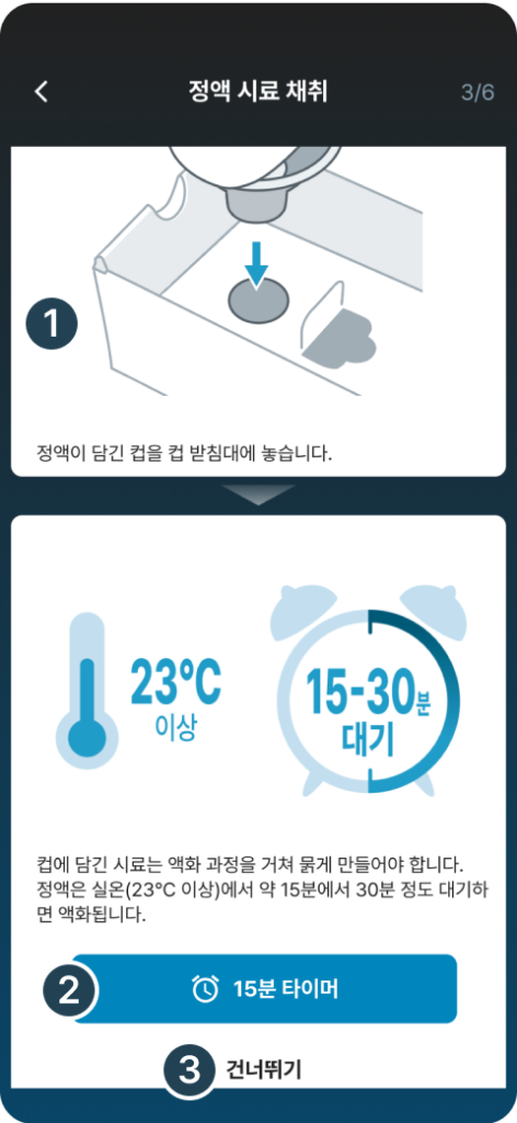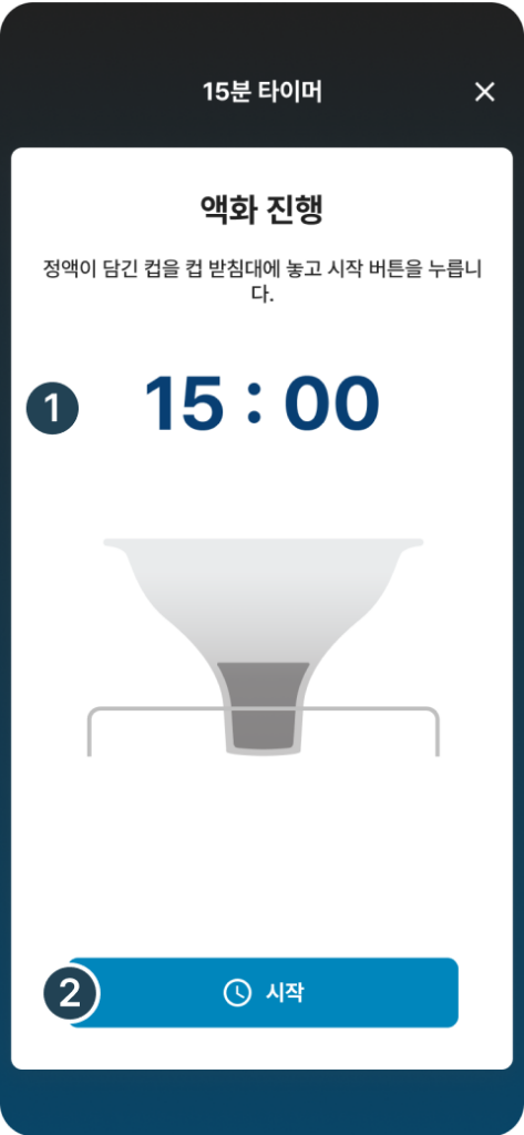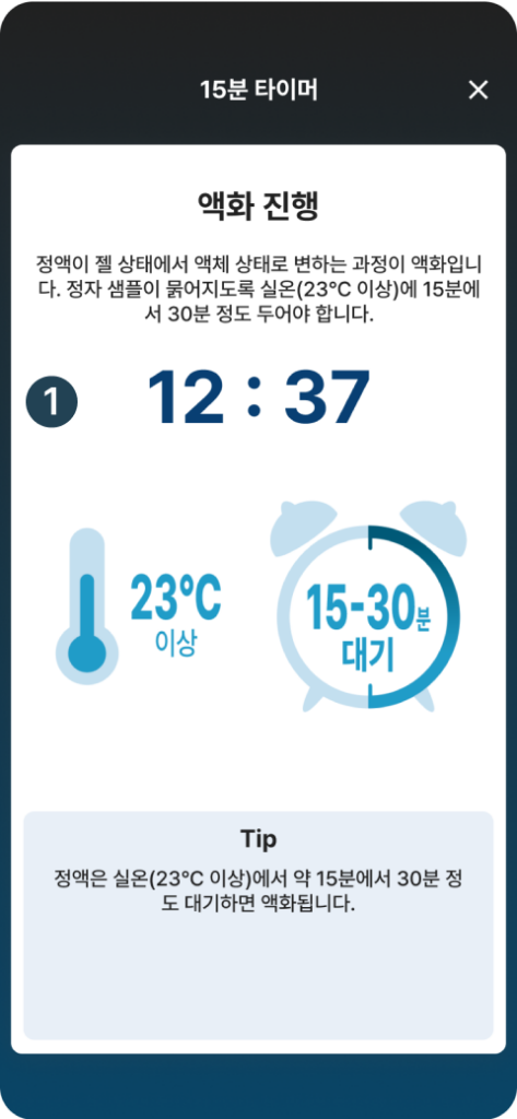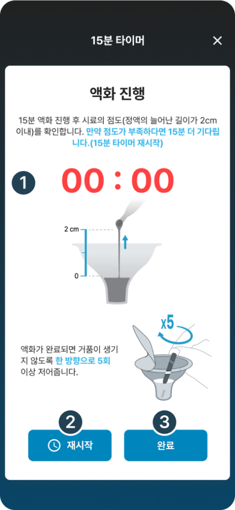 - 15분 타이머 버튼을 눌러 액화 진행을 합니다.